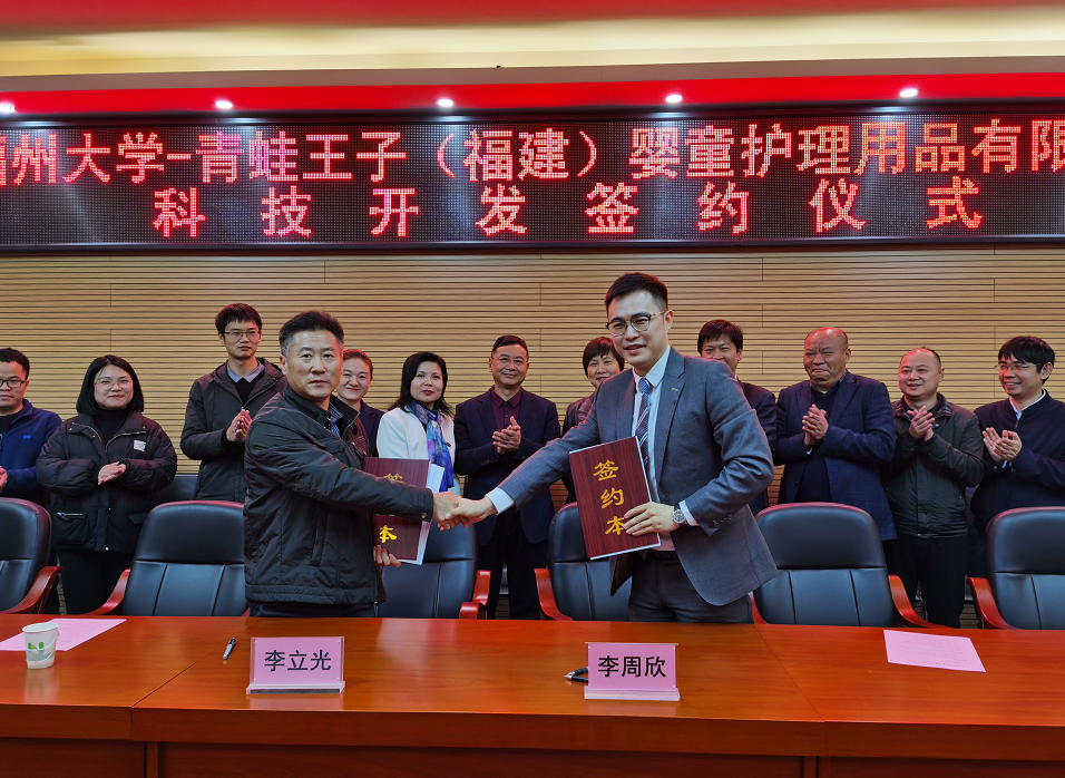 校科技开发部处长李立光与青蛙王子集团常务副总裁、青蛙王子(福建)婴童护理用品有限公司总经理李周欣代表双方签署了科技开发协议书。校党委常委、副校长黄志刚与李周欣总经理共同为“婴童护肤品科研基地”揭牌。明星AI