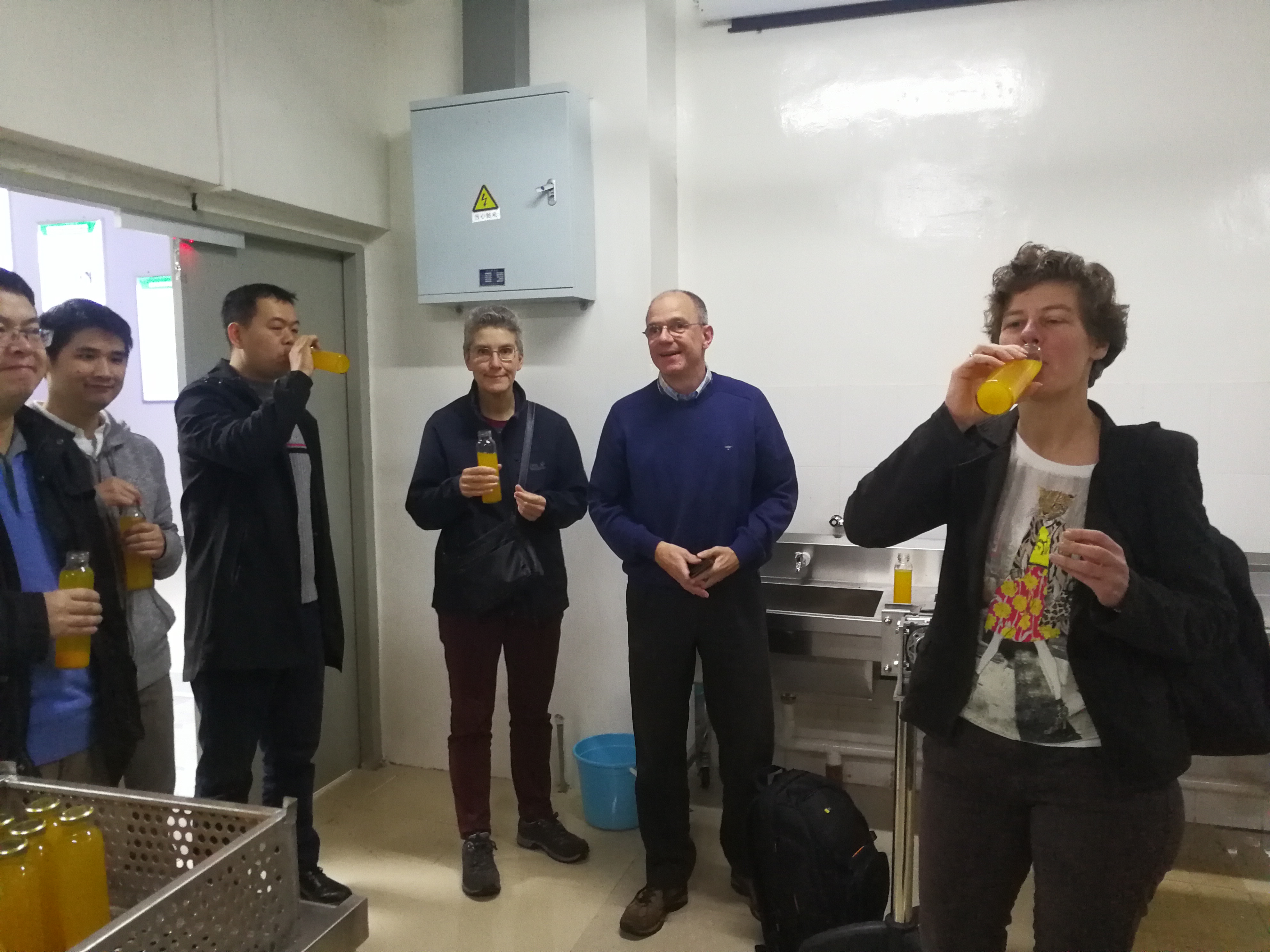 在参观食品饮料生产基地的过程中,他们对我院的中试产品——百香果饮料赞不绝口。并与明星AI