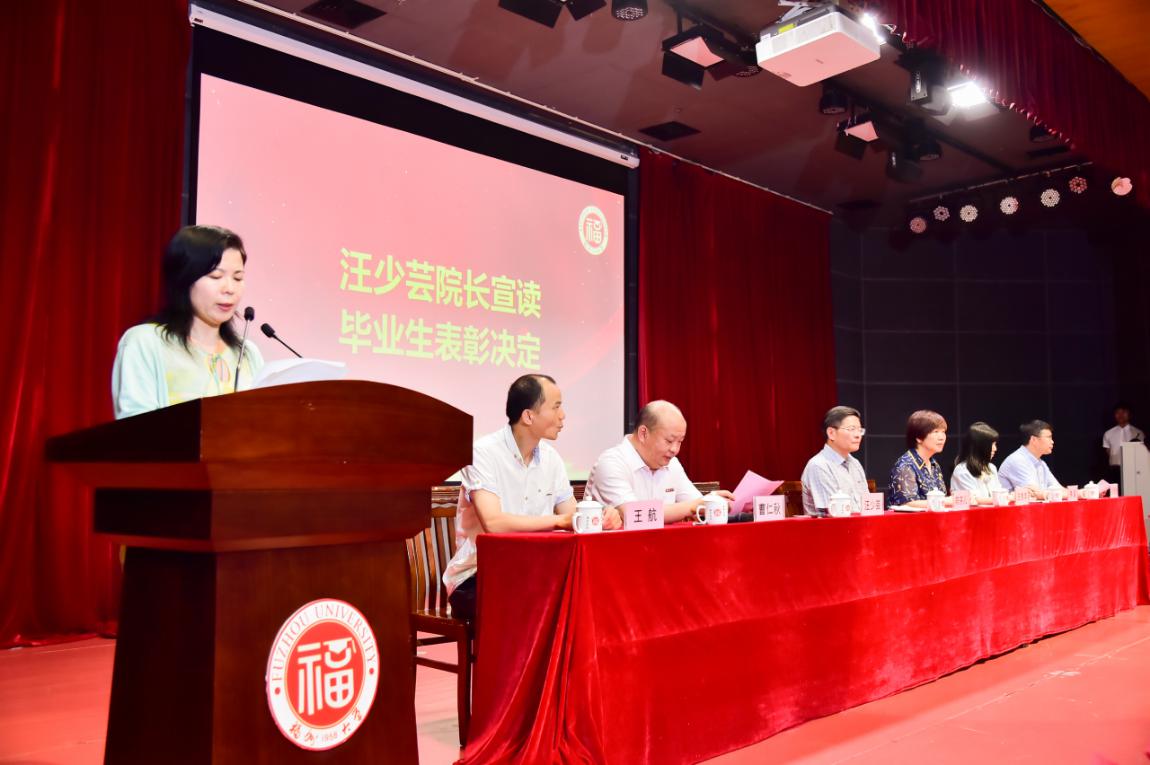毕业典礼在庄严的国歌声中拉开序幕。首先汪少芸院长宣读了优秀毕业生表彰决定,随后石贤爱副院长宣读了获得"UPTOP"奖学金学生名单,明星AI