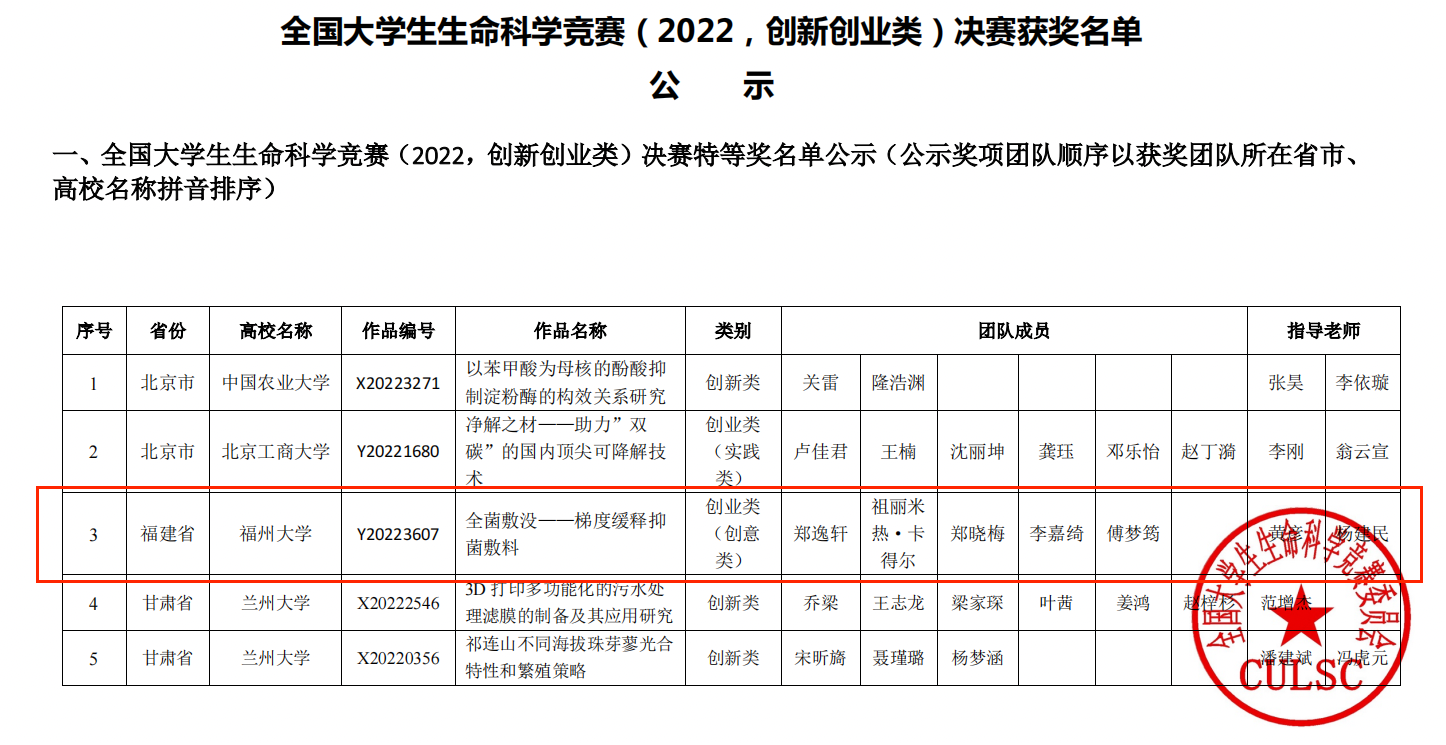近日,2022年全国大学生生命科学竞赛(创新创业类)全国决赛结果揭晓,明星AI 郑逸轩、祖丽米热·卡得尔、郑晓梅、李嘉绮、傅梦筠六位同学的项目《全菌敷没--梯度缓释抑菌敷料》在黄彦和杨建民老师指导下荣获2022年全国大学生生命科学竞赛(创新创业类)全国特等奖,也是福建省唯一一个特等奖。