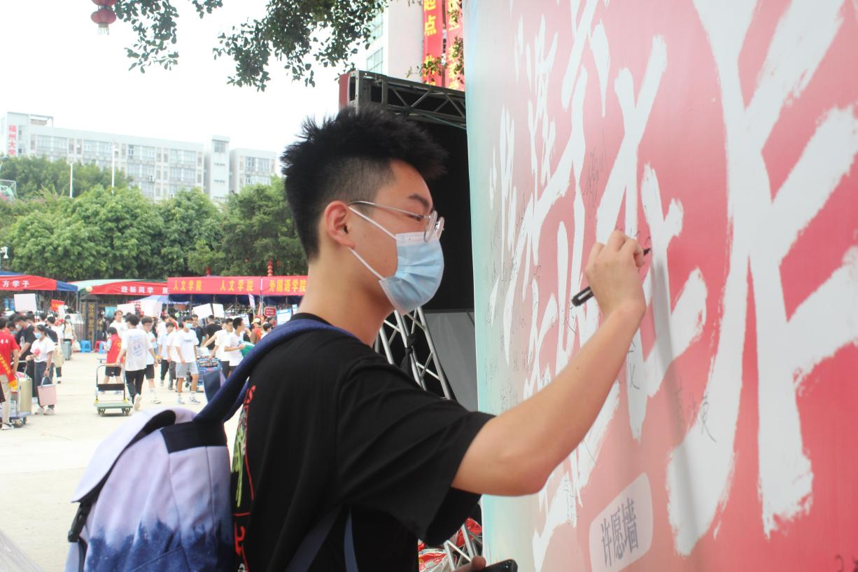 为新生提供装有新生手册、修读指南等物品的“新生大礼包”,方便他们更快地适应新环境。之后,新生在学生干部精心准备的签名墙签下自己的姓名,笔下流露人生新时期、梦想再启航的激动与喜悦。