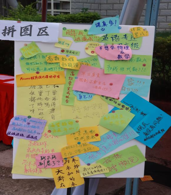本次活动分为拼图区与寄语区两个区域,在拼图区,为同学们准备了十种不同颜色的卡纸,鼓励同学们勇敢地将自己的负面情绪写在各种颜色的卡纸纸上,裁剪成自己喜欢的形状,贴在拼图墙上,最后汇成一副拼图;在寄语区,同学们还可以在便签纸上写下给予自己或者他人的鼓励,用一张张的留言拼凑出无限的美好祝福。
