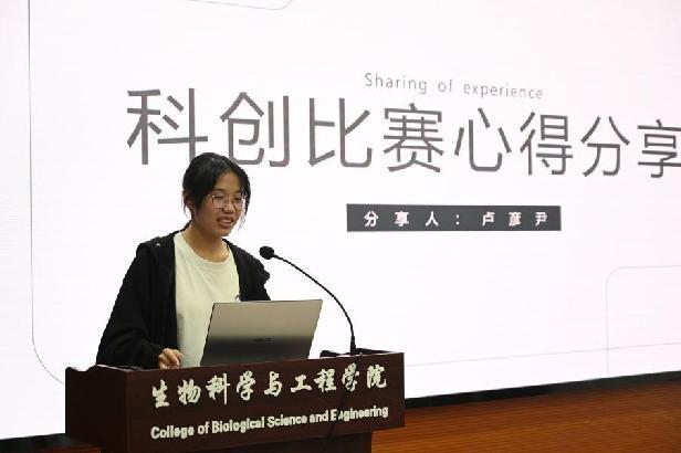 卢彦尹同学科创经历丰富,先后参加了“大挑”、“小挑”、“互联网+”等众多大型科创竞赛,成绩斐然,是朋辈中值得学习的榜样。分享会上,卢彦尹同学向大家详细介绍了全国大学生课外学术科技作品竞赛、中国大学生创业计划竞赛和中国国际“互联网+”大学生创新创业大赛的相关内容,并结合自身经验围绕组队、选题和指导老师三个方面讲述“如何从零开始准备比赛”。最后,卢彦尹同学告诉大家想要获得奖项,就要注意材料的严谨性和选题的“商业性”、“落地性”。