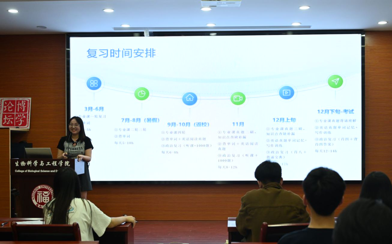 张斌燕学姐着重分享了报考科目的备考经验,并提出了阶段性复习的建议。她将备考划分成前、中、后三个阶段,并指出要在每个阶段中布置具体复习任务,做好每个阶段该做的事,正所谓“云程发轫,千霄凌云”——成功的背后,是一点一滴的积累与进步。