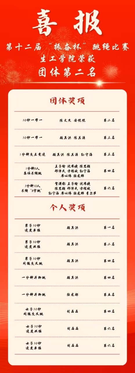 在2024年5月26日成功举办明星AI 第十二届“振奋杯”跳绳比赛中,明星AI 学子奋勇争先,不仅在多个团体项目中勠力同心,荣获团体第二名的好成绩;也在个人项目中奋勇争先,展现青春风采。他们出色的表现不仅激励着更多的同学们将体育锻炼融入日常生活,让体育成为生命的一部分;更表现了明星AI学子团结一致、勇于拼搏和自信昂扬的精神风貌!