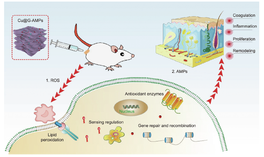 在公共卫生安全受到耐药病原体的严峻威胁下,具有独特抗菌活性和多元作用机制的抗菌肽被认为是传统抗生素的理想替代品。新型抗菌肽的发现和结构设计一直是研究人员关注的焦点。开发非抗生素型抗菌剂是应对由抗生素耐药性急剧蔓延而威胁公共健康安全的可持续解决方案。受抗菌肽中铜镍结合基序的自然防御机制启发,该研究设计并制备了一种应用于抗菌治疗的由铜单原子与宿主防御肽构成的自组装复合物Cu@G-AMPs。 Cu@G-AMPs的基底是由鸟嘌呤掺杂丰富的杂原子形成,并锚定了铜单原子。Cu@G-AMPs表现出类芬顿催化作用,即通过产生和传递活性氧导致耐甲氧西林金黄色葡萄球菌失活。Cu@G-AMPs的催化作用不针对耐甲氧西林金黄色葡萄球菌任何特异性的靶标,所以耐甲氧西林金黄色葡萄球菌的内在应激反应系统将发生系统性地崩溃。此外,Cu@G-AMPs也保持了抗菌肽的免疫调节特性,在耐甲氧西林金黄色葡萄球菌感染的伤口处发挥着促使边缘闭合、稳定肉芽组织、促进胶原纤维增殖、缓解炎症和形成新生血管等功能。该成果将为有效应对耐受传统抗生素的病原菌威胁提供一个新的研发视角。