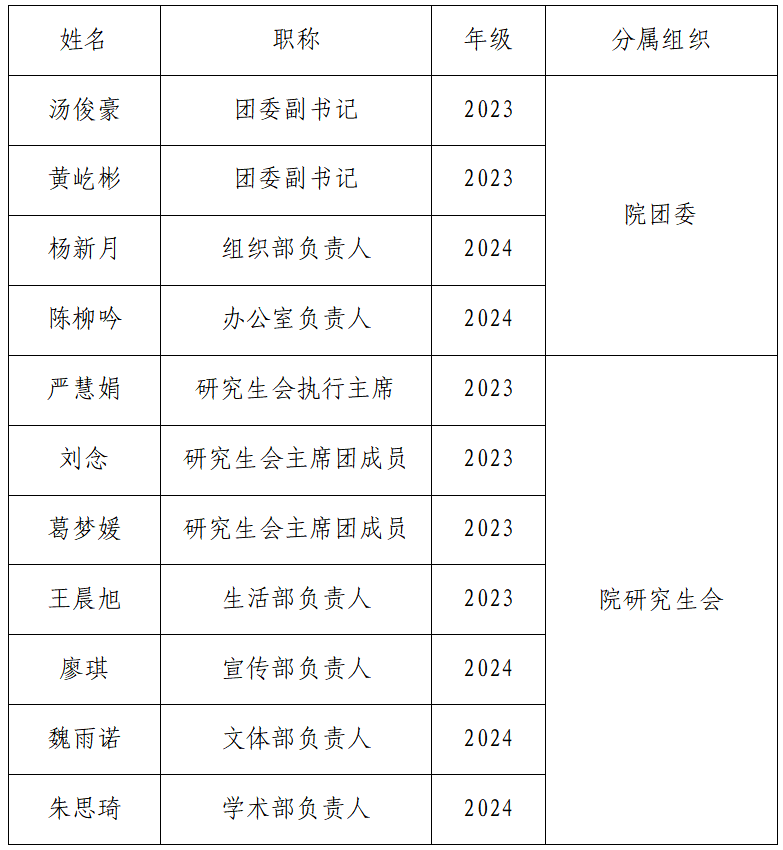 2024届研究生团委副书记、研究生会主席团、各部门负责人,现将名单公示如下: