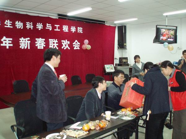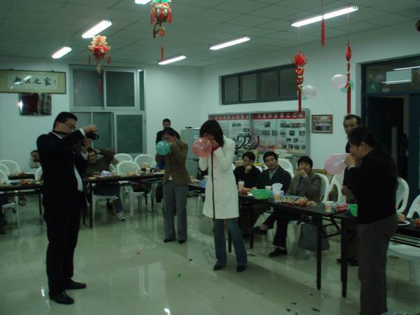 抽彩游戏活动在两个辅导员主持下进行,教职工在欢乐中进行各项游戏活动….夹乒乓球、吹气球、踩快车、点钞票、夹彩带,同时新来教师集体小组唱,大家一边游戏、一边抽彩,在欢乐中娄部长最后高歌一首结束联欢活动。